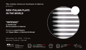 INTENSO by Denise Diaz First performance in Lebanon Monnot Theatre, Beirut December 23, 7:30 pm Directed by Lama El Amine Intense by Denise Díaz is a two-voice dialogue that explores the conflict between love and survival, between the desire to escape and fear of the world. Betty and Cassandra inhabit a closed, degraded space that […]