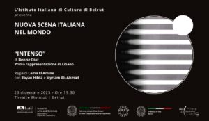 INTENSO di Denise Diaz Prima rappresentazione in Libano Teatro Monnot, Beirut 23 dicembre, ore 19:30 Regia di Lama El Amine Intenso di Denise Díaz è un dialogo a due voci che esplora il conflitto tra amore e sopravvivenza, tra il desiderio di fuga e la paura del mondo. Betty e Cassandra abitano uno spazio chiuso […]